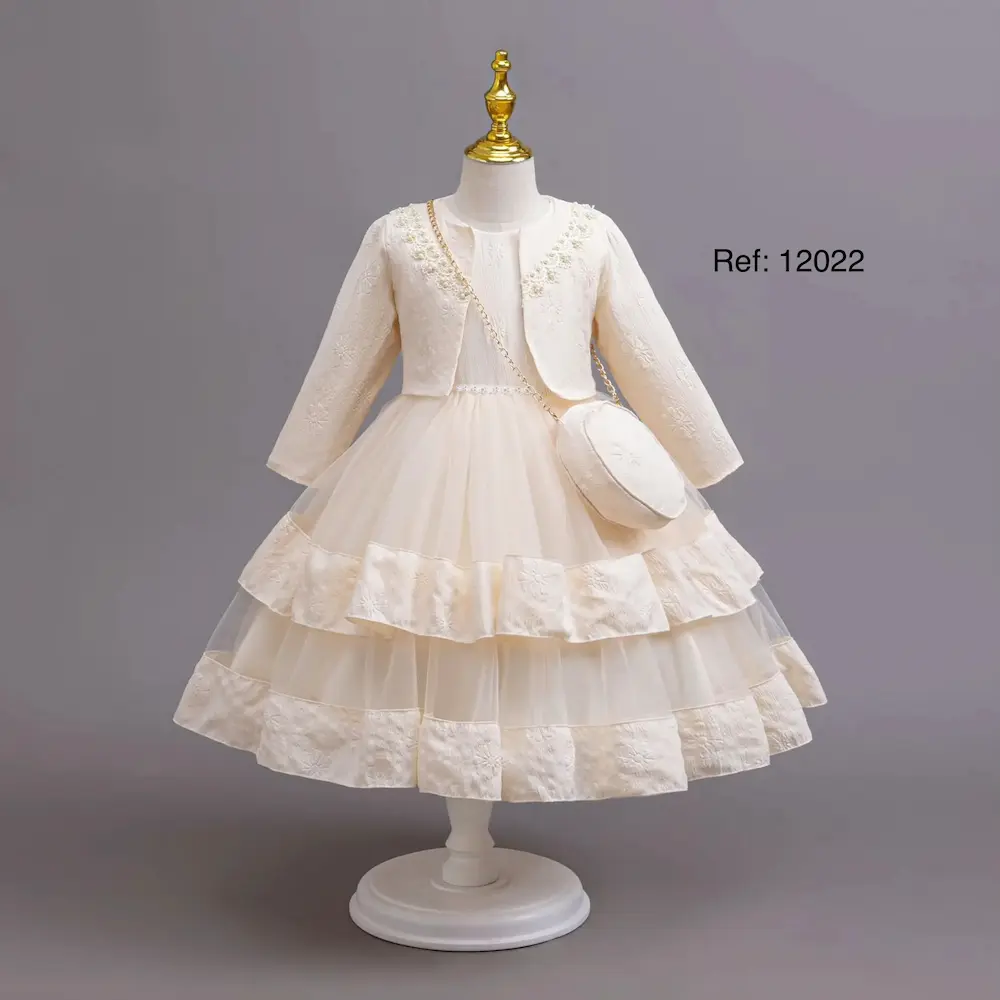 La chaqueta, elaborada en tela bordada con detalles florales, aporta un toque clásico y refinado, perfecto para climas frescos o celebraciones religiosas. El conjunto se completa con un bolso a juego, que suma estilo y practicidad, haciendo que tu pequeña luzca impecable y encantadora.
