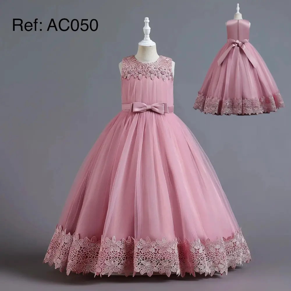 La falda, amplia y confeccionada en capas de tul ligero, crea un volumen encantador que realza la silueta tipo princesa. En el borde inferior, un encaje floral exquisito añade un acabado refinado que convierte este vestido en una opción ideal para eventos especiales.