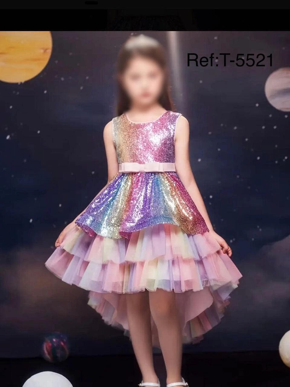 Un diseño deslumbrante que captura la magia de las estrellas. Confeccionado con un corpiño cubierto de lentejuelas multicolor que reflejan la luz como un cielo estrellado, y una falda asimétrica de tul en capas degradadas, este vestido es perfecto para brillar en cualquier evento especial. La cintura está adornada con un delicado lazo, aportando un toque dulce y femenino. Disponible en combinaciones de azul y rosado, este modelo es ideal para pequeñas soñadoras que quieren destacar con estilo y elegancia.